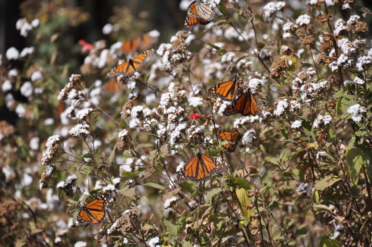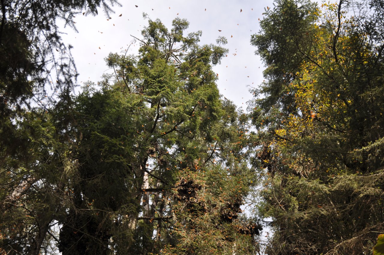 Die Monarch Falter sind hoch oben in den Bergen auf ca 3000m. Dort drängen sie sich bei Nacht alle an wenigen Bäumen zusammen. Wenn die Sonne dann die Wärme bringt, fliegen Sie auf. Das ist ein irres Schauspiel.
