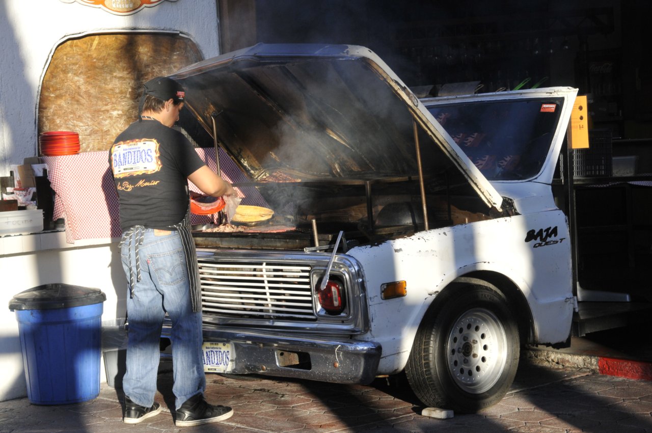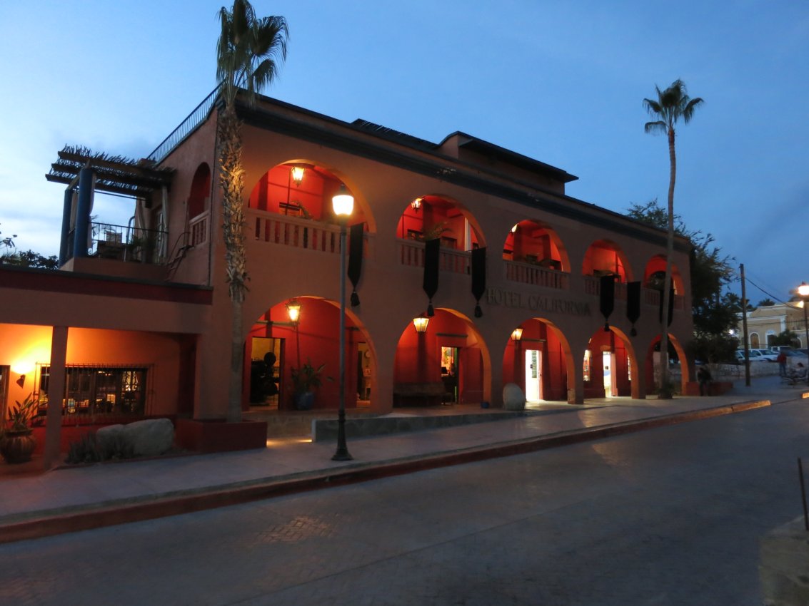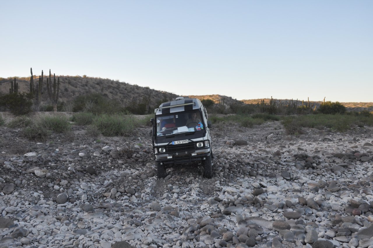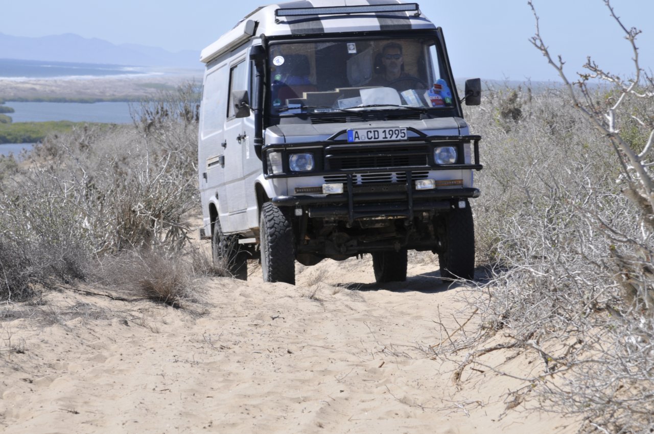 Am Weg weiter in den Süden ist es dann soweit. Er erste richtige Defekt am Bus. Irgendwann mußte es ja kommen ... aber warum denn jetzt schon. Glück im Unglück - es ist genau vor Loreto (der einzigen größeren Stadt in der Umgebung) passiert. Das Radlager ist hinüber. Und Ersatzteile gibts hier nicht - na super. Aber wieder haben wir einen richtigen Dusel.... Bernhard (ein Freund aus Wien) kommt uns in ein paar Tagen hier in Mexico besuchen. Er wird die Teile mitbringen. Nachdem Loreto uns jetzt nicht so gut gefällt, lassen wir unseren Seytani in der Werkstatt stehen, und mieten ein kleines Auto. Denn wir müssen ja schliesslich auch nach La Paz Bernie abholen. Aber erstmal fahren wir noch zwei Tage nach Todos Santos. Dort ist auch das berühmte Hotel California (von den Eagles besungen... wer die nicht kennt, der muß eben Googlen ...).