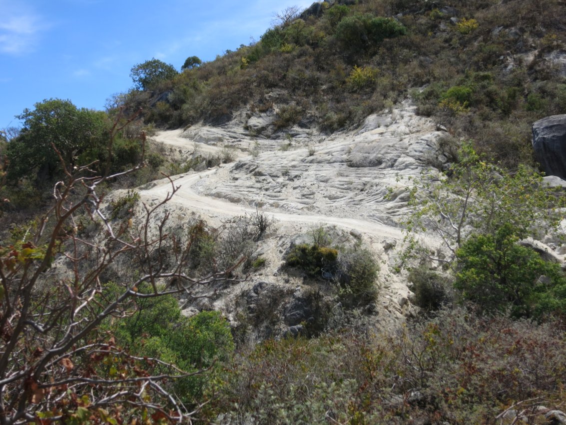 Bis sie ganz weggespühlt ist, und wir im Flußbett stehen. Aber umkehren ist nicht... und außerdem sehen wir vorne schon die Hauptstrasse. Die 200m müssen doch zu schaffen sein.